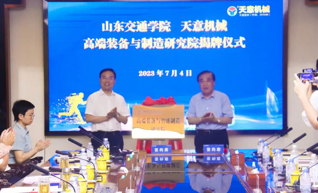 對(duì)接會(huì)上,山東交通學(xué)院黨委書記王煥斌與山東天意機(jī)械股份有限公司董事長劉洪彬共同為天意機(jī)械—山東交通學(xué)院高端裝備與智能制造研究院揭牌。